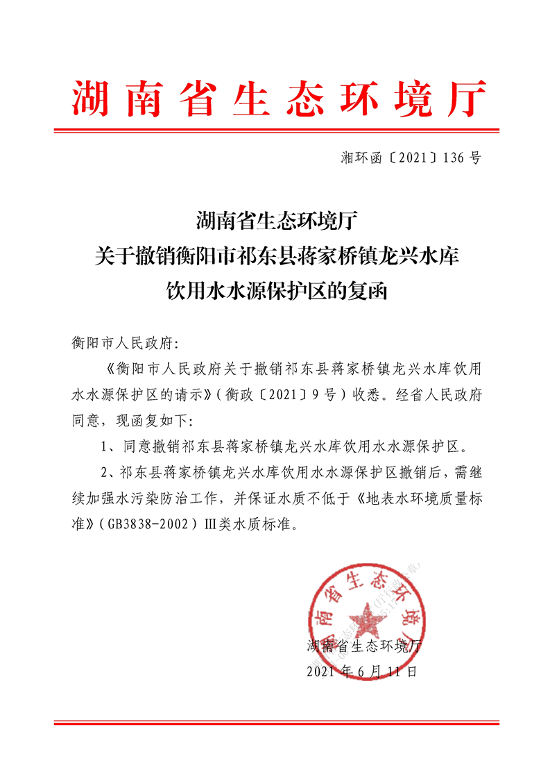 關(guān)于撤銷衡陽市祁東縣蔣家橋鎮(zhèn)龍興水庫飲用水水源保護(hù)區(qū)的復(fù)函