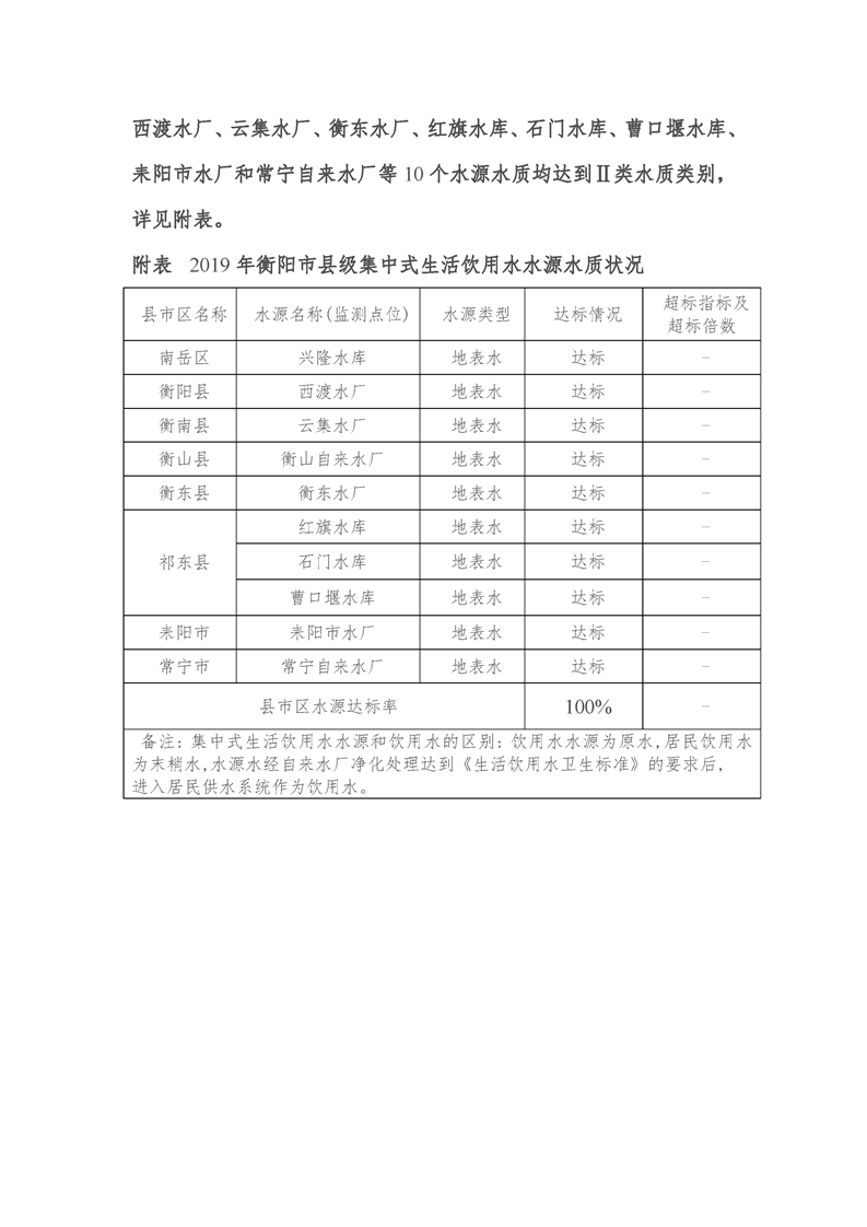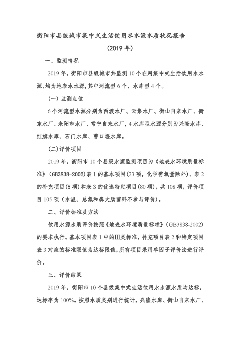 衡陽市縣級城市集中式生活飲用水水源水質(zhì)狀況報告(2019年)