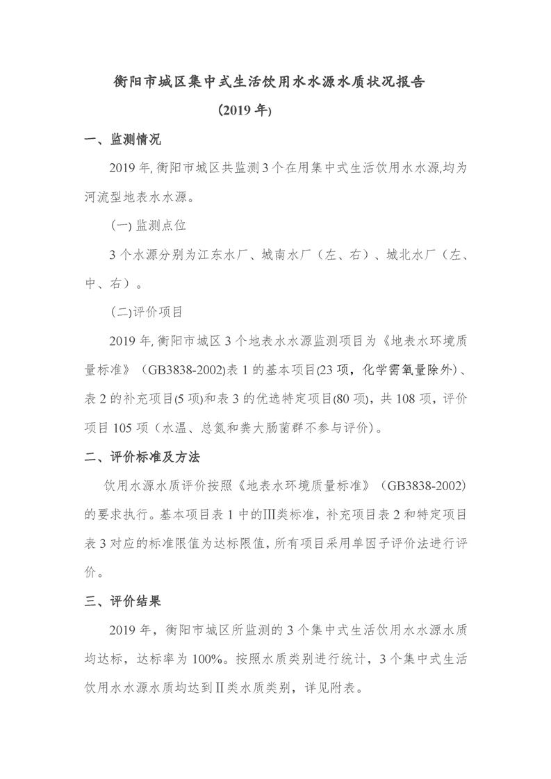 衡陽市城區(qū)集中式生活飲用水水源水質狀況報告(2019年)