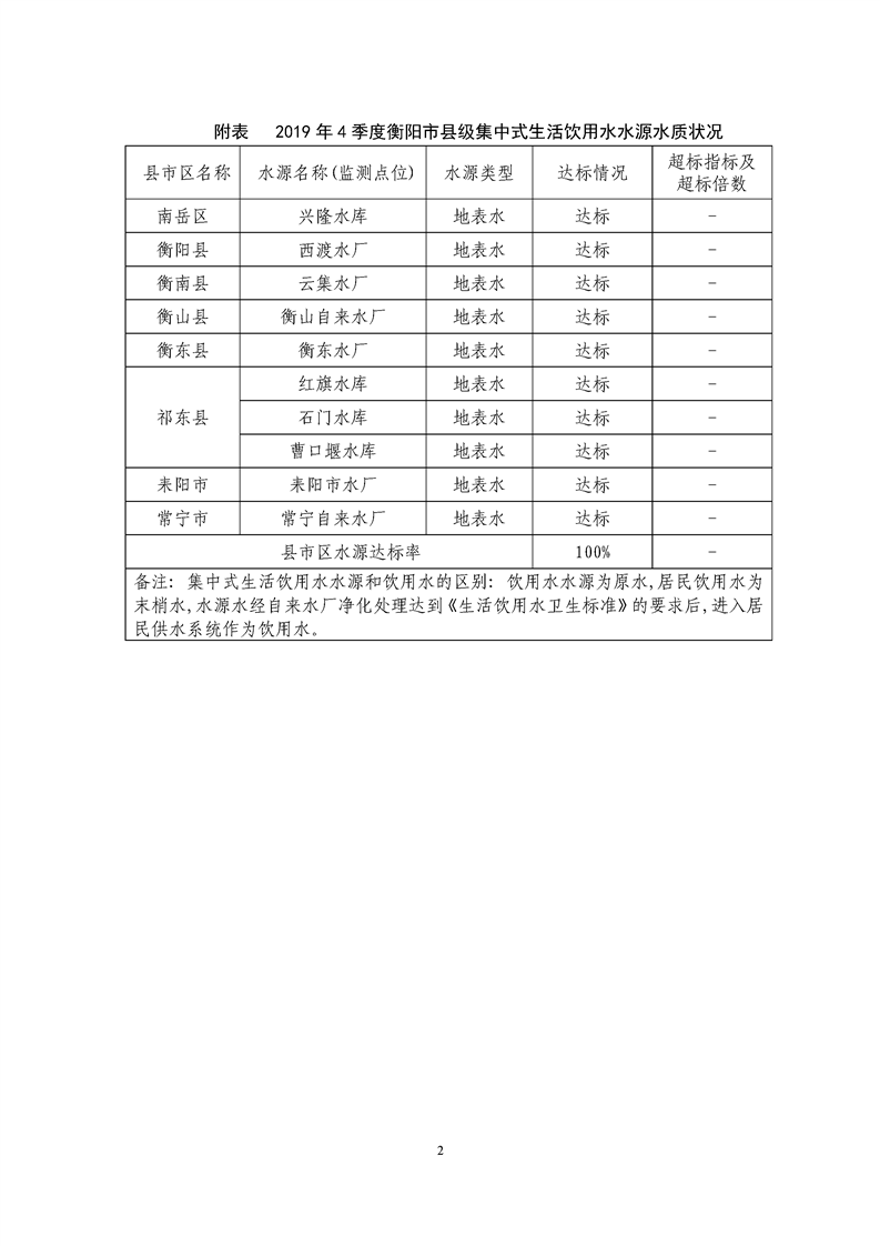 衡陽市縣級城市集中式生活飲用水水源水質(zhì)狀況報(bào)告(2019年4季度)