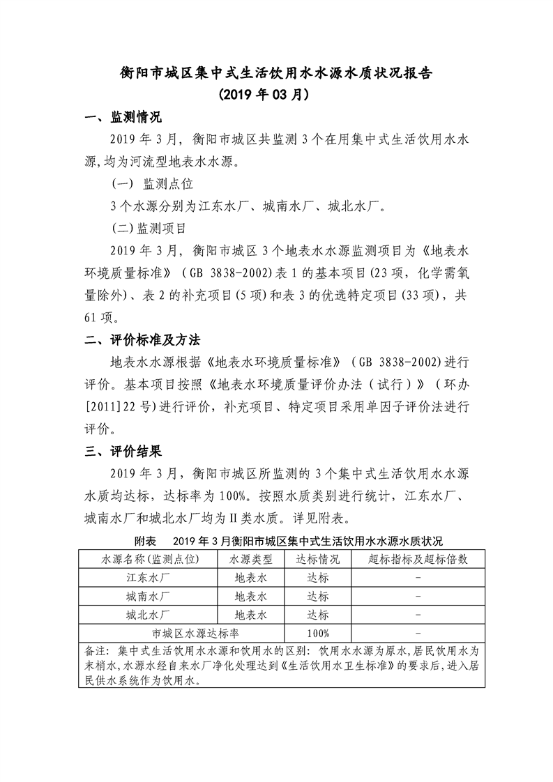 衡陽(yáng)市城區(qū)集中式生活飲用水水源水質(zhì)狀況報(bào)告(2019年03月)